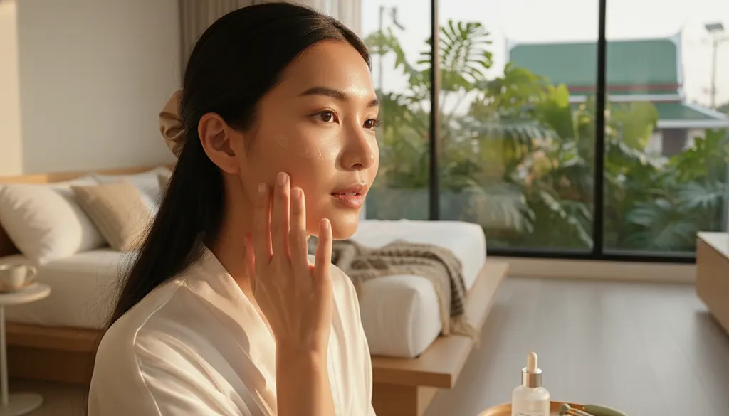 เลือกเซรั่มน้ำหนักเบา ซึมไว เช่น Hyaluronic Acid (HA) ขนาดโมเลกุลเล็ก หรือเซรั่มน้ำแร่ 2-3 หยด ตามด้วยมอยส์เจอไรเซอร์สูตรเจลบางๆ ทาแล้วรอ 1 นาทีให้แห้ง หลีกเลี่ยงครีมหนักที่ทำให้ผิวลื่น ตัวอย่าง: พี่แอนใช้น้ำแร่ Vichy ทาเช้า ผิวชุ่มแต่ไม่เหนียว เมคอัพไม่ไหลแม้เหงื่อแตกตอนเดินห้าง